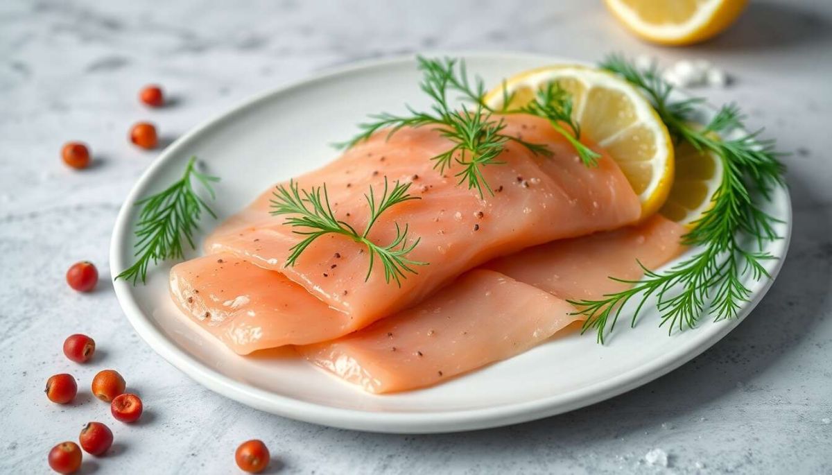 Disposez les tranches de saumon sur une large assiette, en veillant à ce qu'elles ne se chevauchent pas pour garantir une infusion optimale des saveurs.