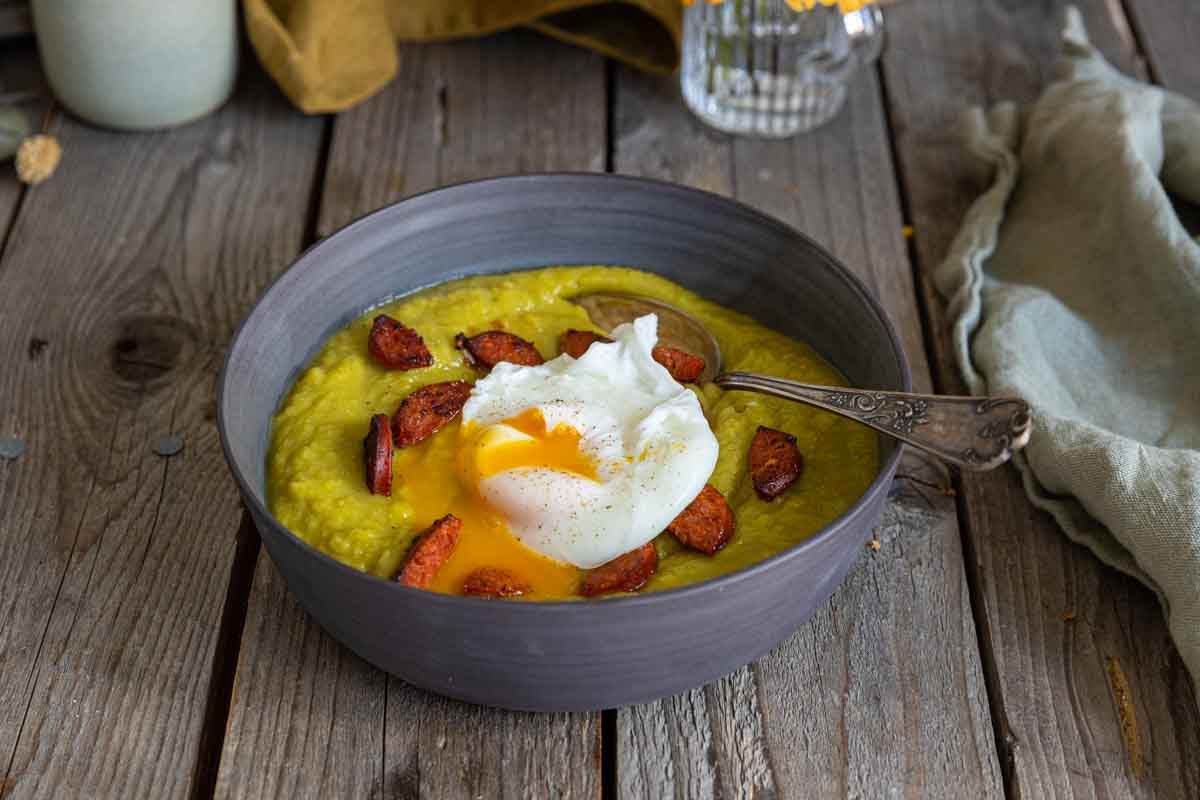 - Pendant ce temps, coupez le chorizo en demi-rondelles. Faites-le griller dans une poêle antiadhésive sans matière grasse et déposez-le sur du papier absorbant pour retirer l'excédent de graisse. Faites pocher les œufs dans de l'eau bouillante vinaigrée et salée pendant 3 minutes.