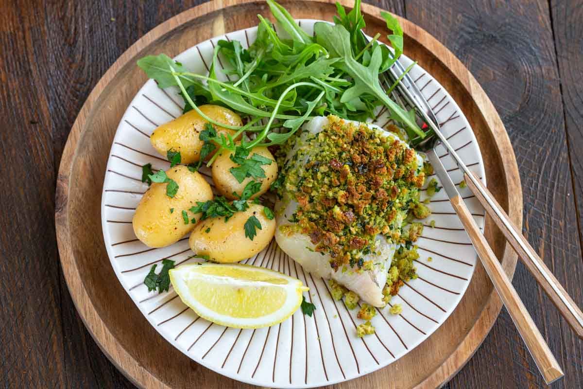 En effet, j'ai intégré un mélange herbacé croquant pour créer une croûte gourmande sur les pavés de cabillaud. L'accompagnement est simple : des pommes de terre vapeur et de la roquette, mais n'hésitez pas à choisir les légumes que vous préférez.