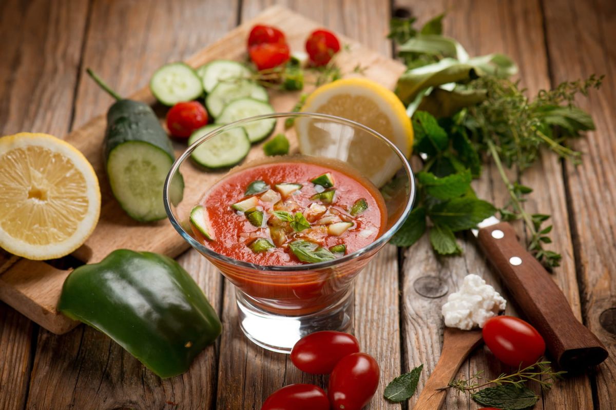 Ingrédients du gaspacho et des croquettes quinoa et feta