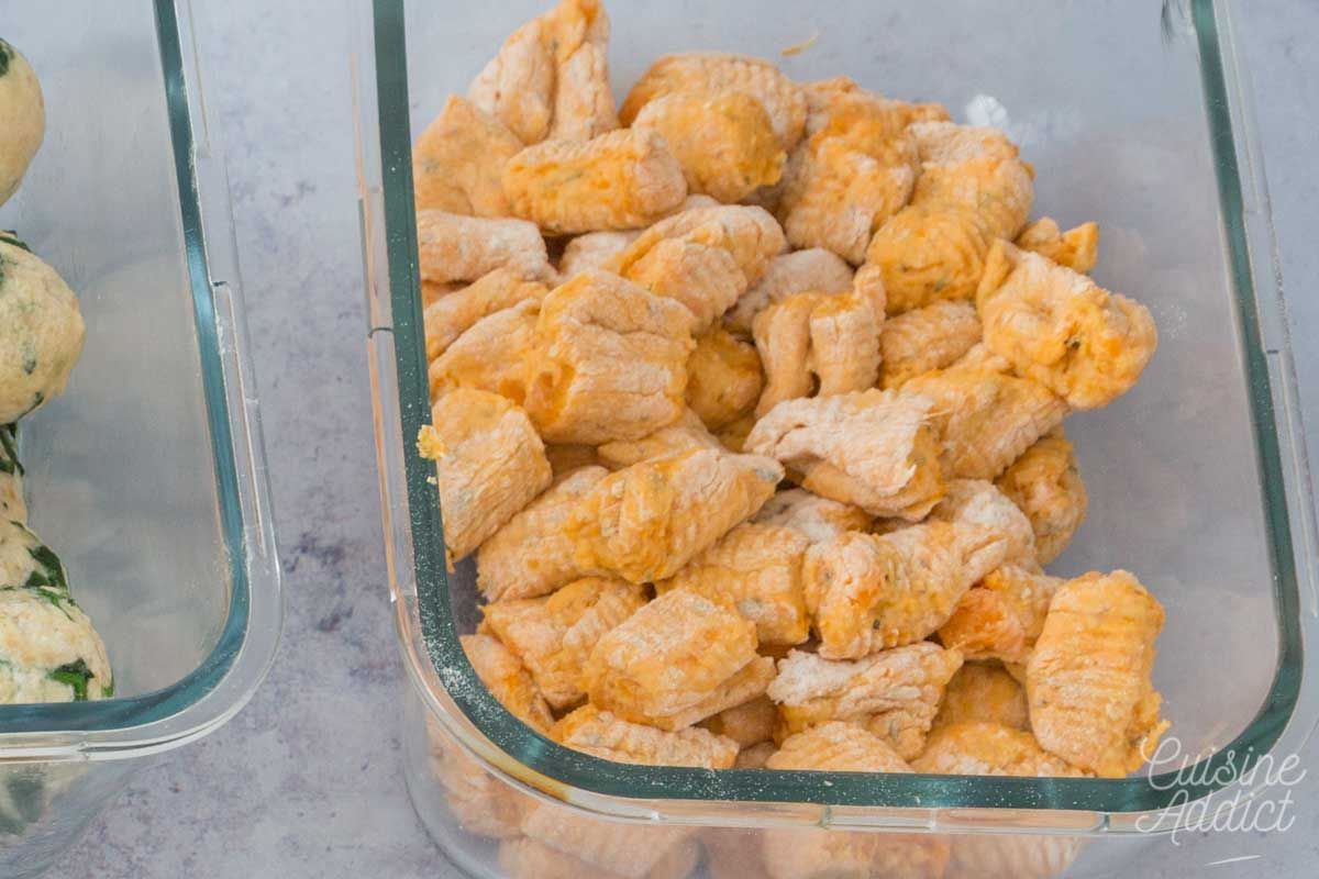 - Mélangez 400 g de purée avec la farine et les herbes de Provence. Assaisonnez avec du sel et du poivre. Sur un plan de travail fariné, formez un boudin et découpez-le en morceaux d'environ 3 cm.