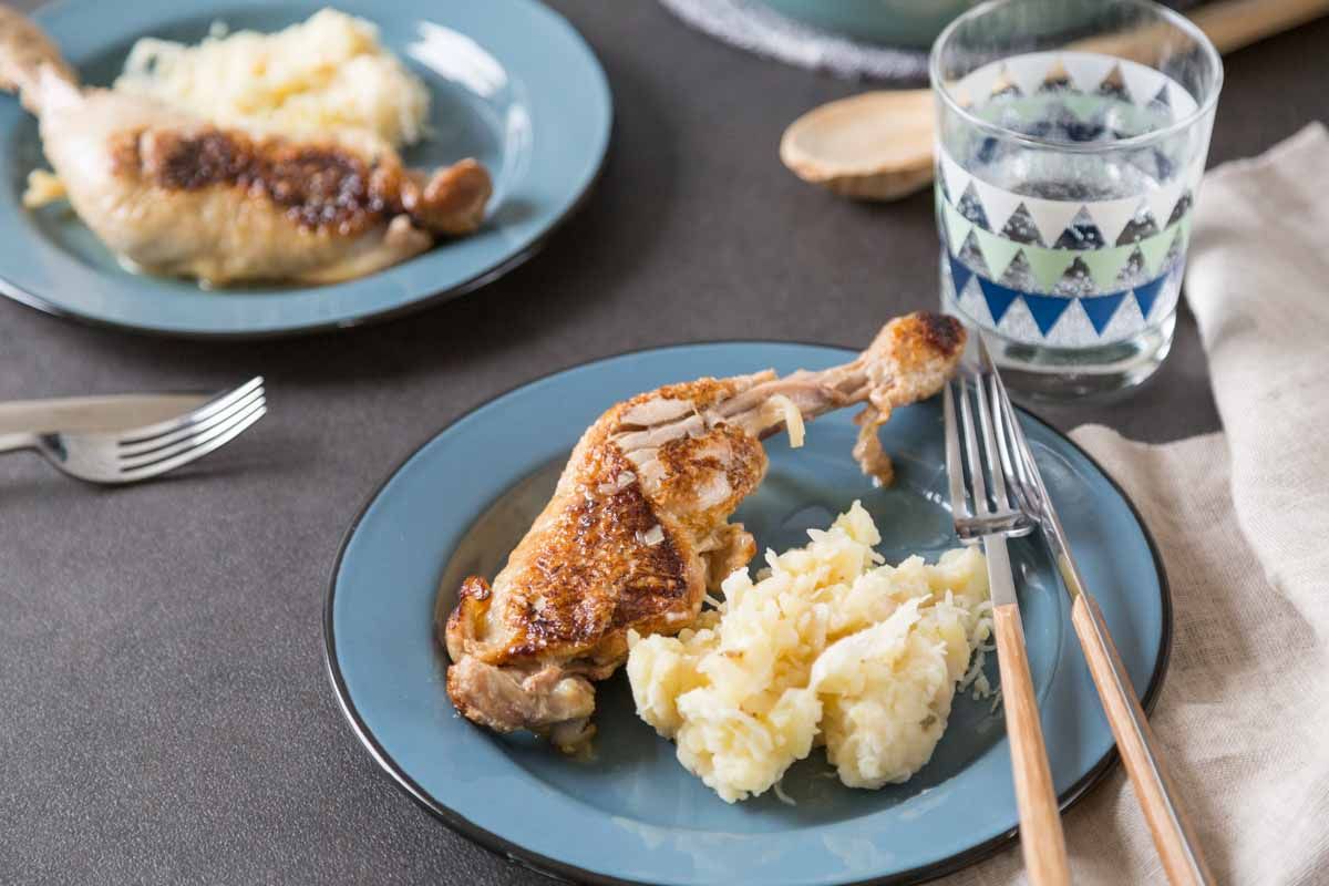 Des cuisses de poulet délicatement grillées à la bière, servies avec une purée savoureuse de choucroute.